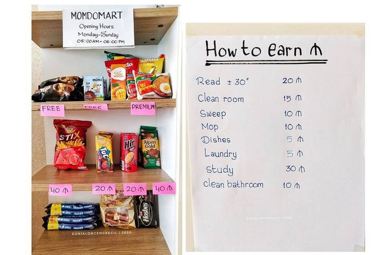 Berbagai aktivitas rumah tangga tersebut memiliki nilai tersendiri, dan nilai itulah yang menjadi mata uang untuk membeli camilan di minimarket untuk anak. Penentuan nilainya bebas. Sebagai contoh, ketika anak membaca buku, dia akan memperoleh nilai Rp10.000, merapikan tempat tidur bisa dapat imbalan Rp5.000, dan semacamnya.